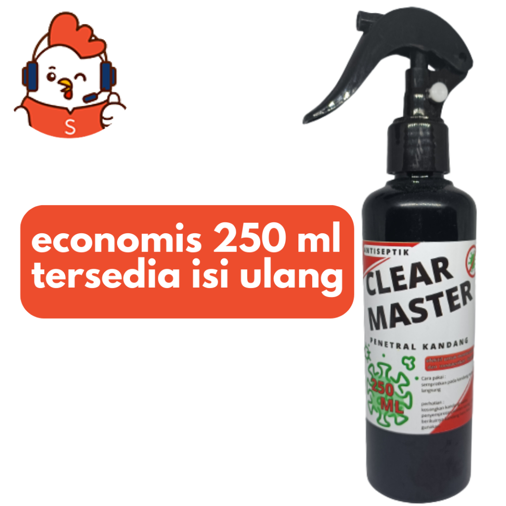 clear master efektif mensterilkan kandang dari kuman virus dan bakteri. aturan pakai lihat pada kemasan tersedia refil atau isi ulang