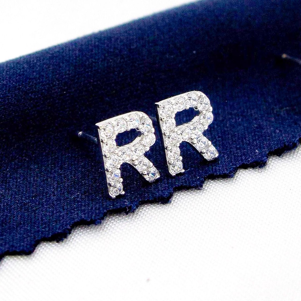 Fashion Bayi & Anak > Perhiasan > Perhiasan Lainnya > Anting anak dan dewasa emas asli kadar 750 75% 17k giwang kerabu huruf permata tanam A S R putih duduk tusuk paku earings 1 gram