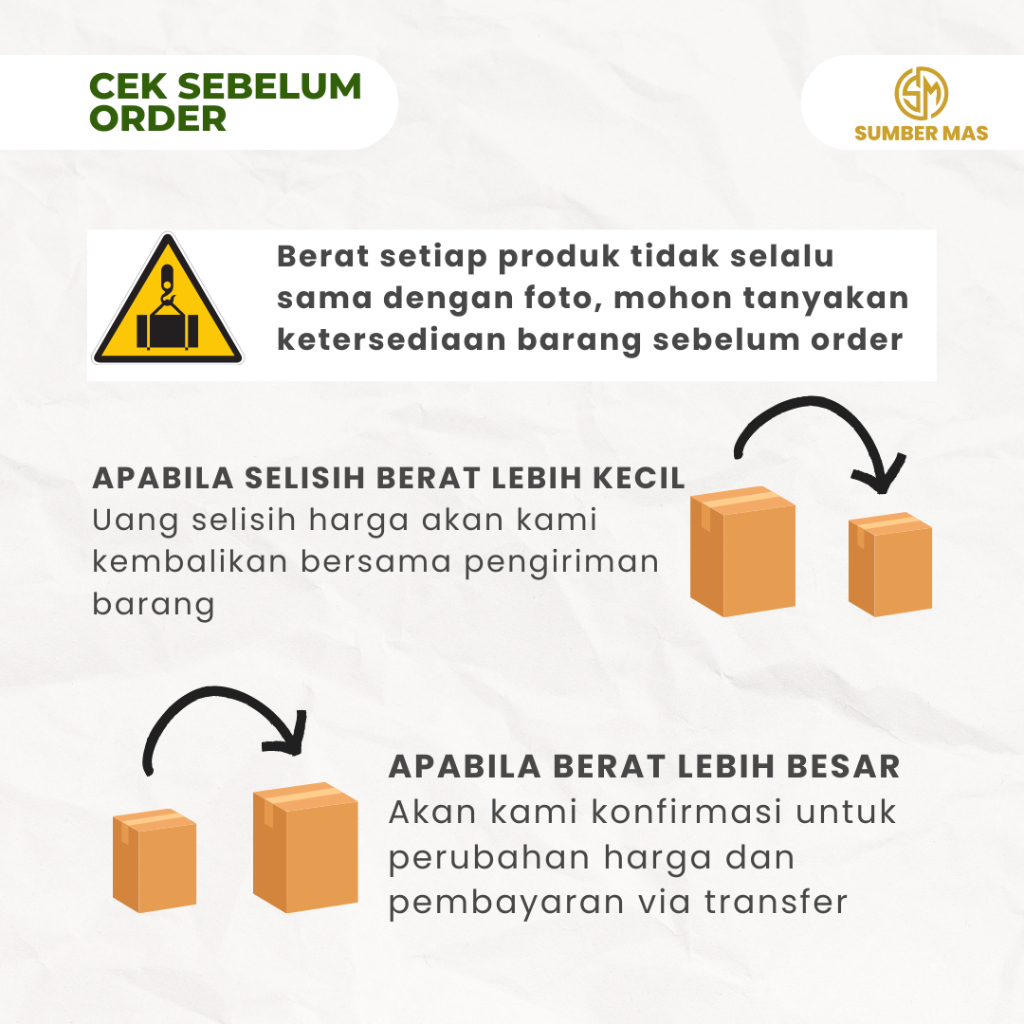 - Setiap pembelian disertai Nota Sumber Mas - Harga yang tertera diatas sudah termasuk PPN - Transaksi diatas jam 16.00 WIB ikut pengiriman hari besok (Kecuali GrabExpress & GoSend hingga pukul 18:00 WIB - Jika harga barang ternyata lebih kecil dari harga yang tercantum saat transaksi, maka uang kembalian akan kami sisipkan didalam paketan - Apabila harga barang ternyata lebih besar dari harga yang tercantum, maka kami akan menghubungi untuk pelunasannya dan pembeli harus transfer kekurangannya