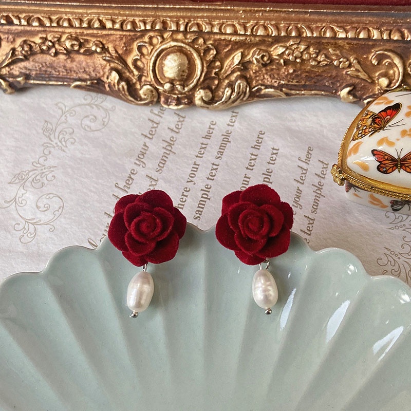Detail Anting Bentuk Bunga Mawar Bahan Velvet Warna Merah Wine Gaya Retro