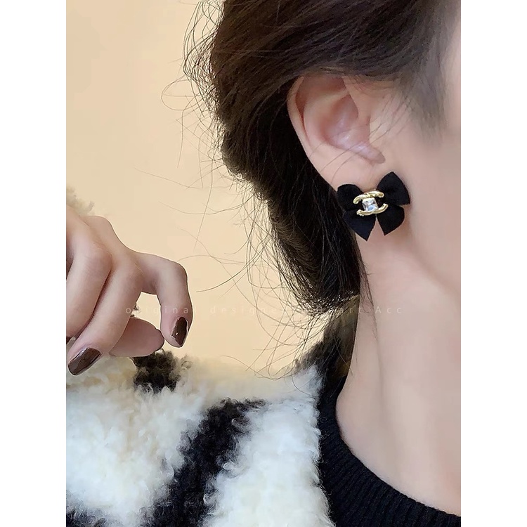 Detail Anting Desain Chanel Pita Hitam Bahan 925 Silver Needle Gaya Retro Perancis Untuk Wanita