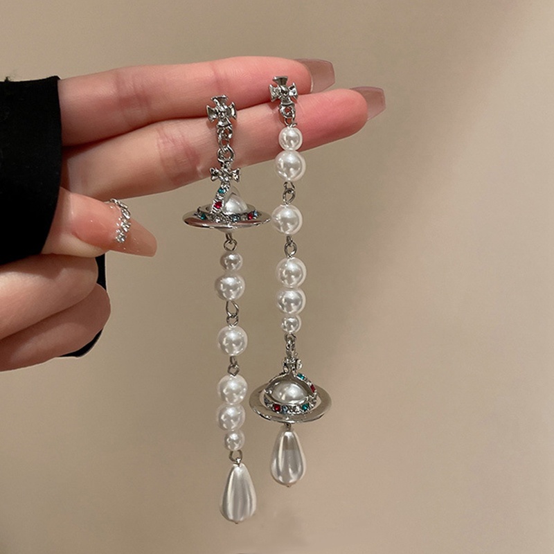 Detail Anting Gantung Panjang Model Salib Dengan Mutiara Imitasi Warna-Warni Untuk Wanita