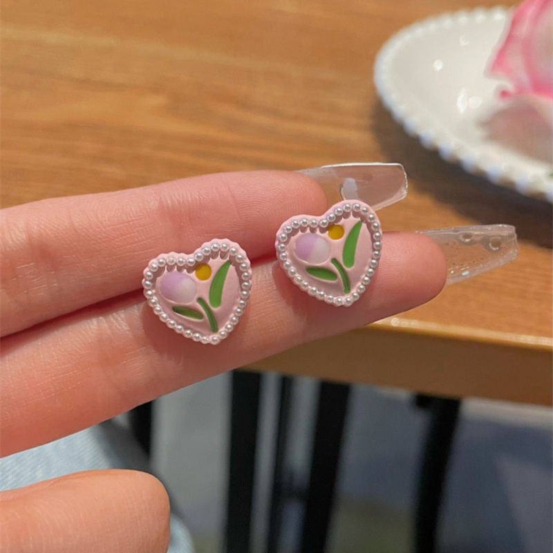 Detail Anting Pejantan Bunga Hati Mutiara Merah Muda2023Musim Panas Anting Tulip Merah Muda Baru Temperamen Anting Wanita Manis