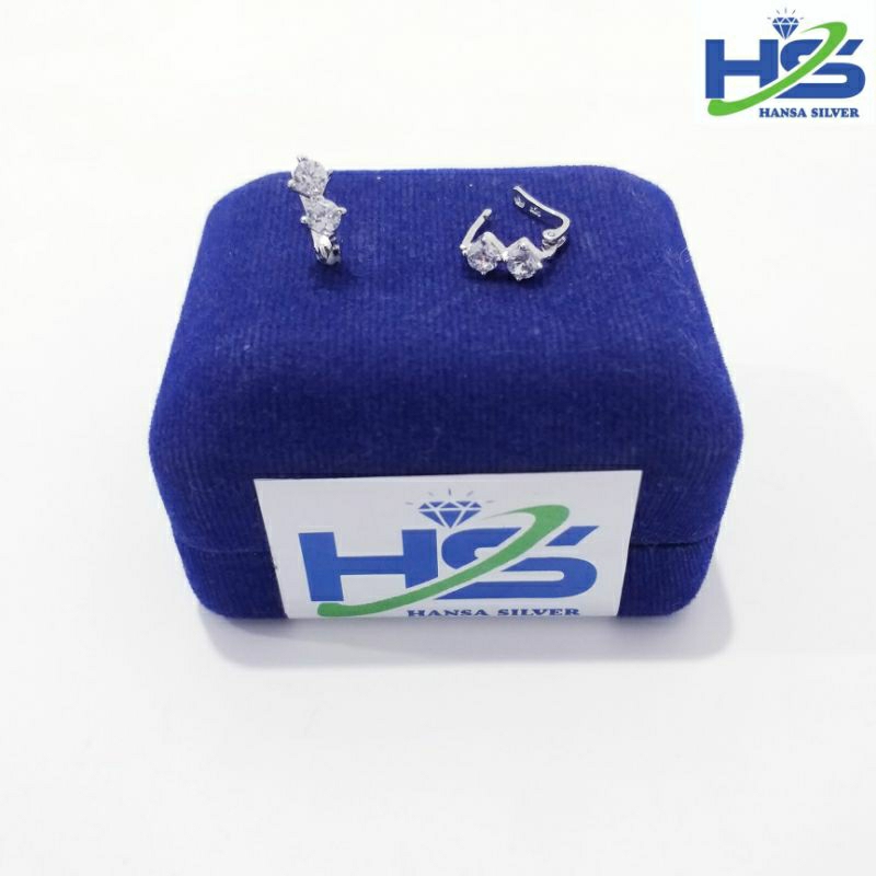 Anting jepit wanita perak asli 925 lapis emas putih model dua permata