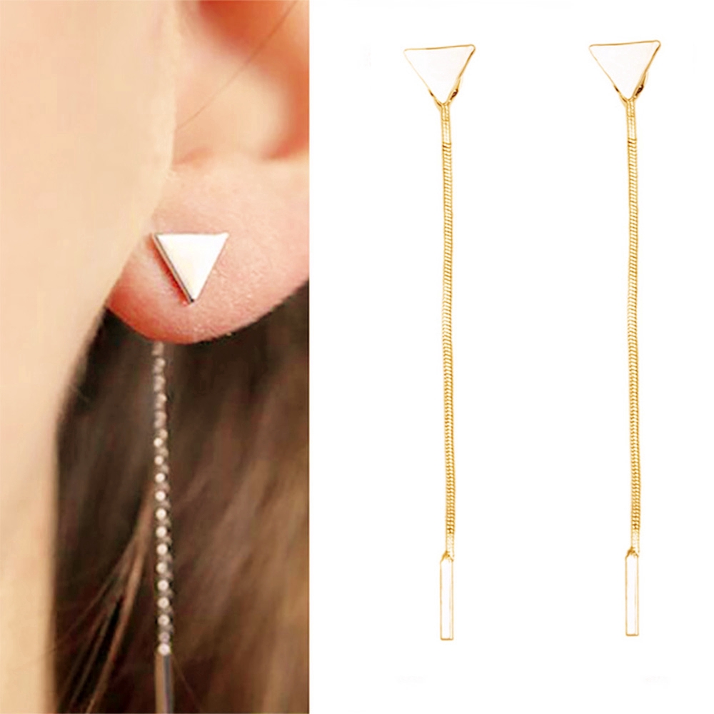 Detail Anting Rantai Rumbai Panjang Bentuk Segitiga Geometris Bahan Logam Warna Emas Dan Perak Gaya Korea