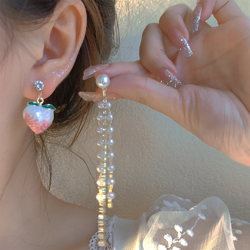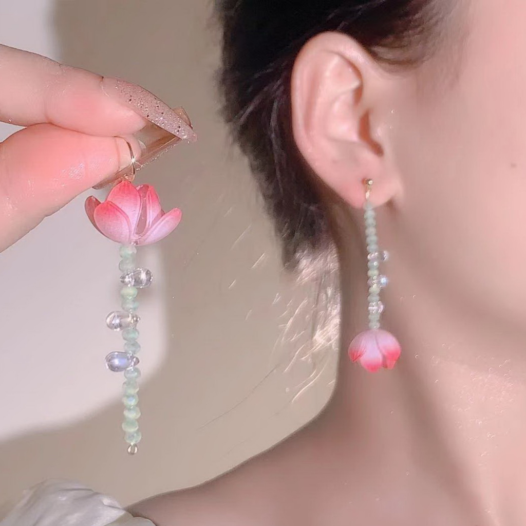 Detail Anting Rumbai Panjang Bunga Asimetris Untuk Aksesoris Perhiasan Wanita, rhinestones Drop Hook Acara Penting