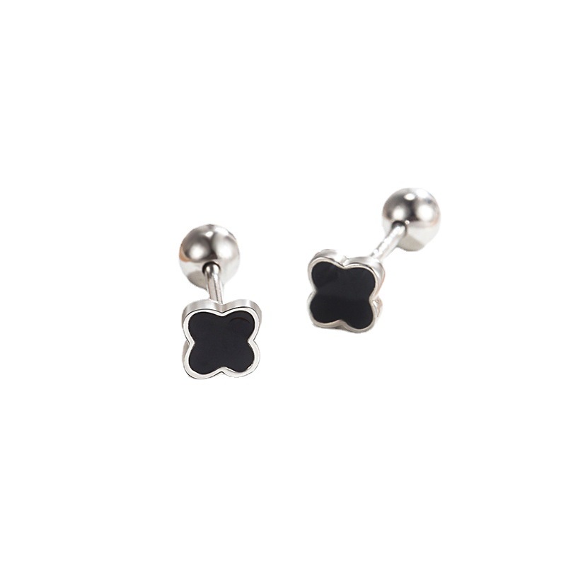 #S925 Perak #Anting Kelopak Empat Daun Hitam Mini #Wanita dengan Sekrup Bulat Cinta #Anting Baru