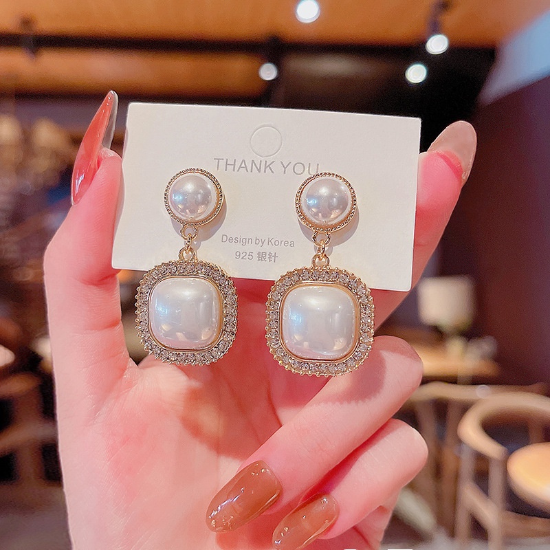 Detail Anting S925 Silver Bentuk Persegi Aksen Mutiara Kristal Gaya Korea Untuk Wanita