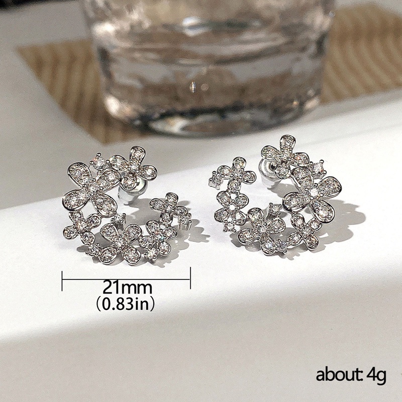 Detail Anting Stud Cubic Zirconia Bentuk C Desain Bunga Romantis Untuk Wanita