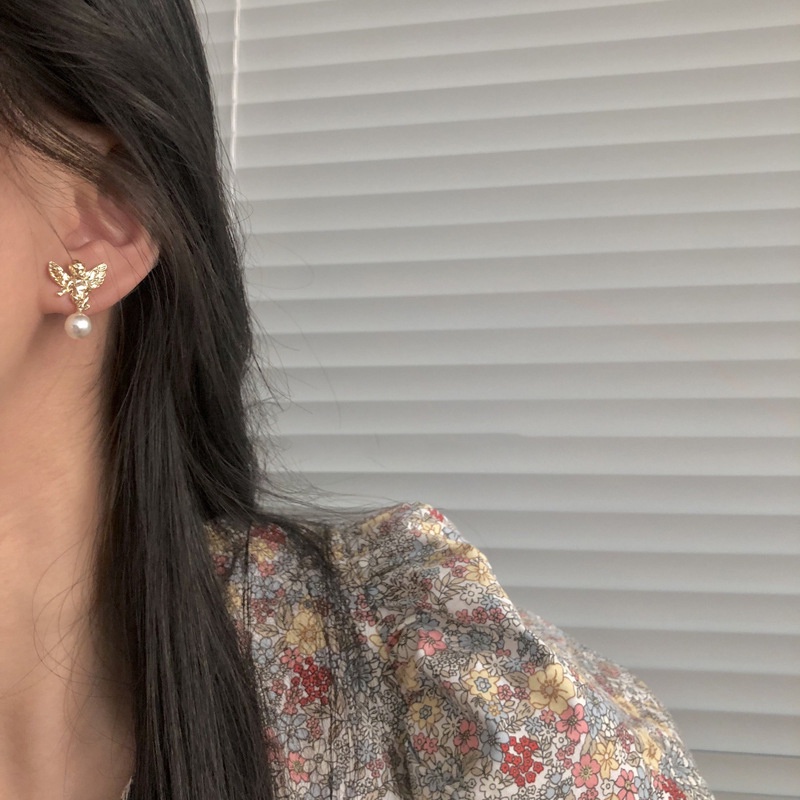 Detail Anting Stud Desain Malaikat Cupid Aksen Mutiara Warna Emas Gaya Retro Perancis Untuk Wanita