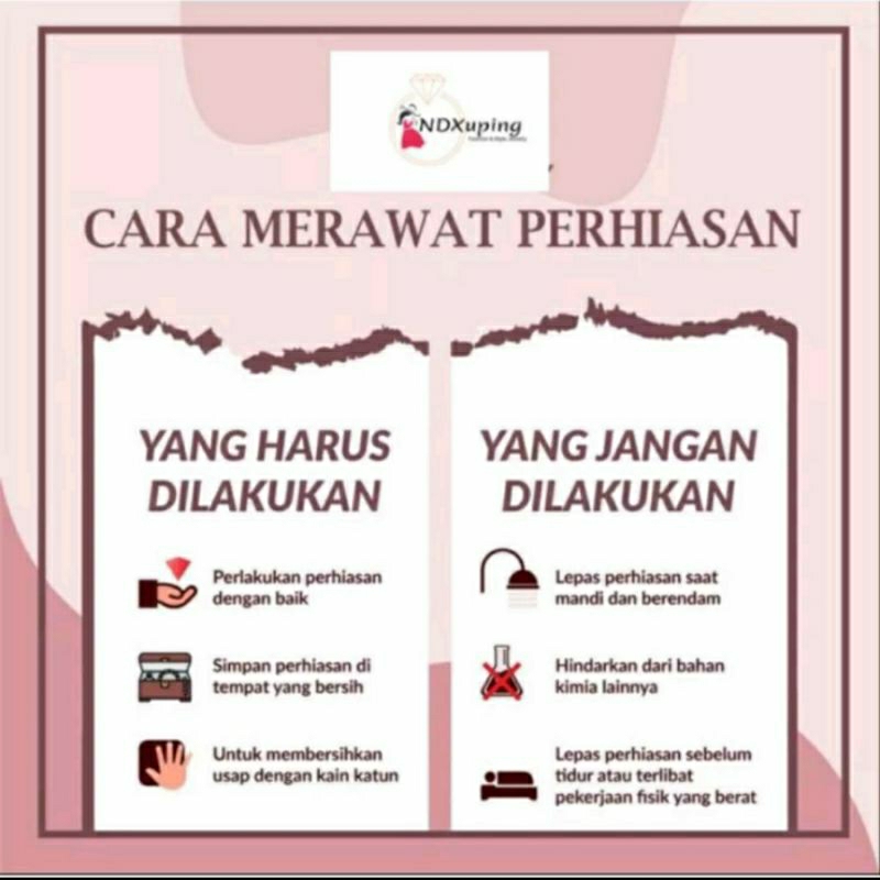 Saran Pemakaian: 1.Jika perhiasan sering terkena keringat, lapisan sepuh perhiasan akan mudah tergerus 2.Untuk mempertahankan kilau dan kebersihan perhiasan poles perhiasan dengan menggunakan kain katun 3.Tidak disarankan memakai perhiasan saat melakukan pekerjaan manual yang berat 4.Untuk jenis kulit tertentu jika mengalami alergi kulit (jarang terjadi) segera hentikan pemakaian perhiasan