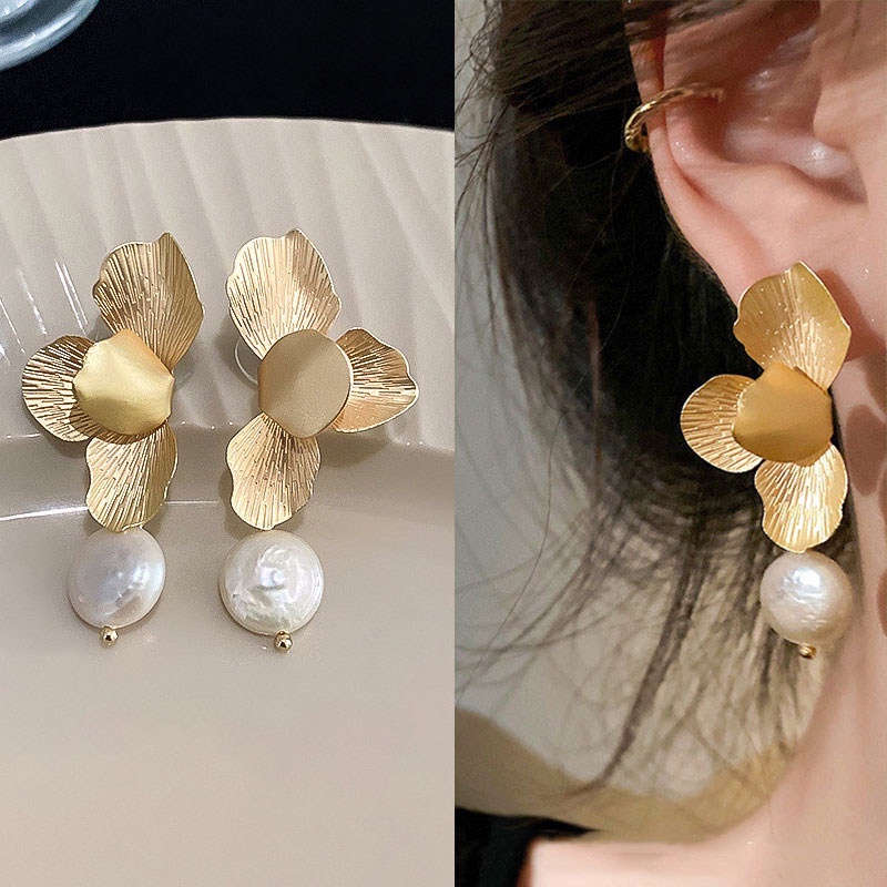 Detail Anting Tusuk Gantung Desain Kelopak Bunga Hias Mutiara Gaya Retrounik Untuk Wanita