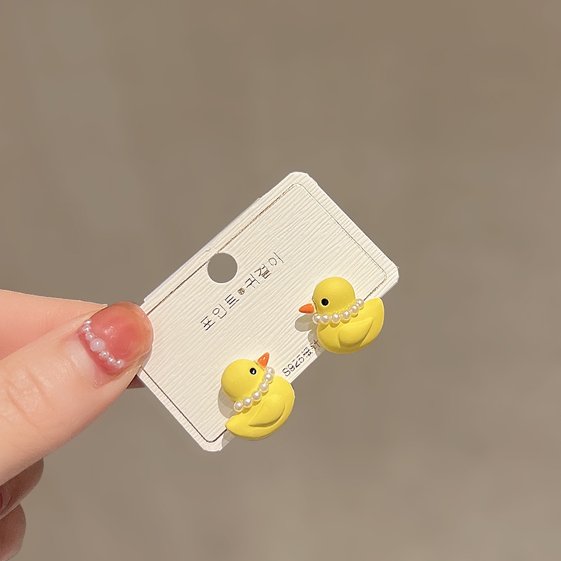 Detail Anting Tusuk Sterling Silver 925 Desain Bebek Kuning Kecil Hias Mutiara Untuk Wanita