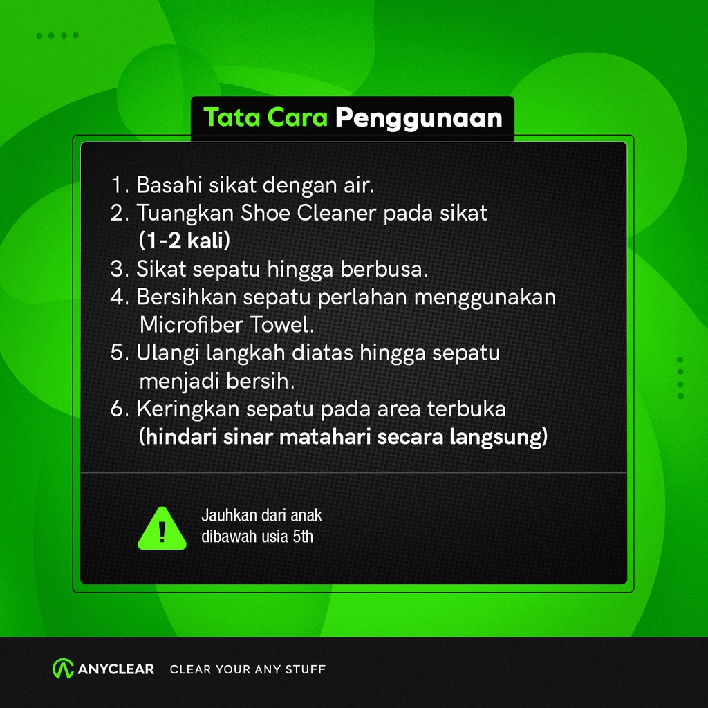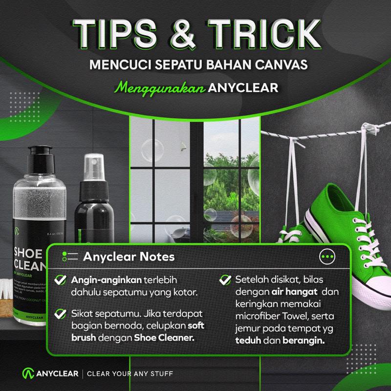 ANYCLEAR merupakan produk yang sangat cocok untuk kalian yang sayang dengan barang-barang seperti sepatu, tas, bahkan topi dengan segala jenis bahan mulai dari canvas, leather, suede, denim, nubuck dan lain sebagainya. Jangan biarin barangmu kotor dan rusak begitu aja ya, yuk saatnya rawat bersama kami💚
