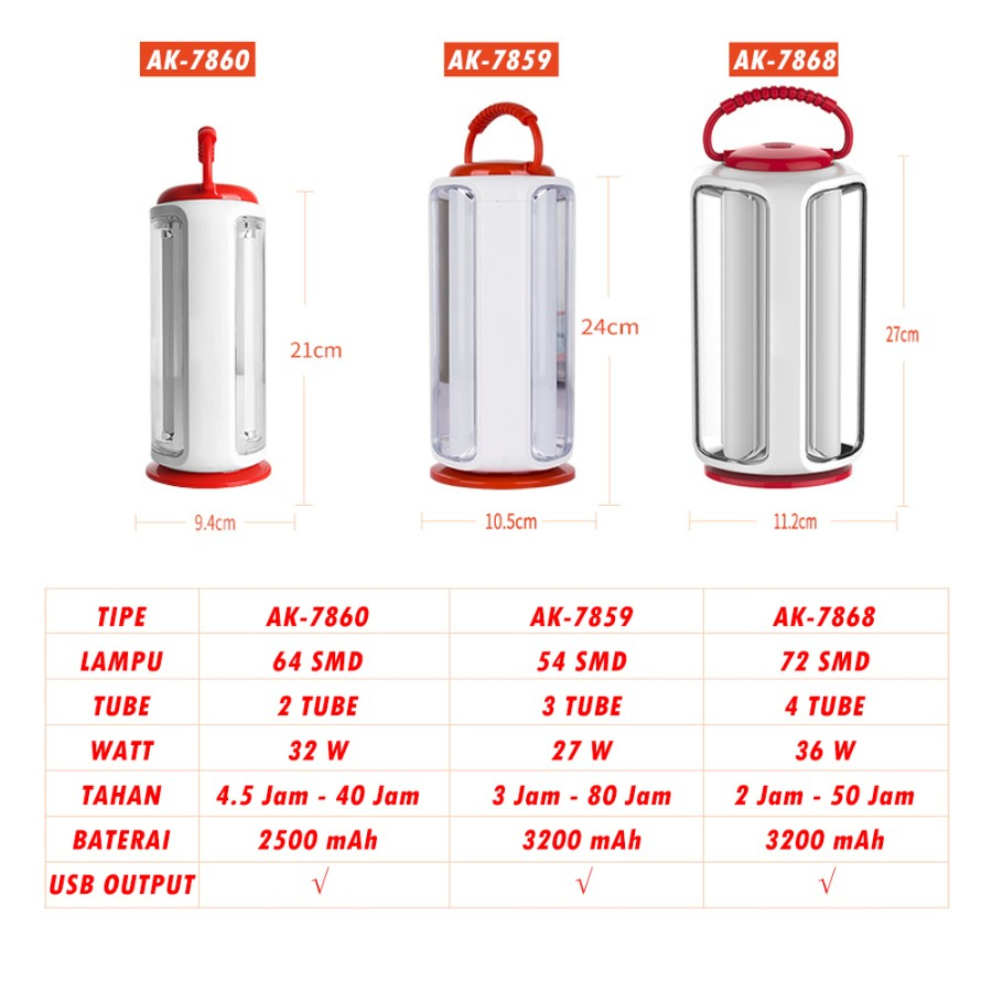 ===================================== Saat menggunakan,tekan dan tahan tombol untuk meredupkan dan menerangkan cahaya (Dimmer). ===================================== 1. Memiliki baterai timbal asam isi ulang berkapasitas 2500 mAh, mudah perawatannya, tahan lama, dapat bekerja hingga 500 kali. 2. Mudah di bawa kemana-mana praktis 3. Menggunakan LED import yang ramah lingkungan, serta cahaya putih yang sangat terang, mengkonsumsi daya rendah. Dengan 64 LED SMD dapat bekerja hingga 40 jam. 4. Produk memiliki overcharge, pengisian berlebih, arus berlebih, dan memuat perlindungan hubung singkat, dll. Untuk secara akurat mendeteksi tegangan pengisian untuk memastikan keamanan pengisian 5. Dual Charging: AC 110V-240V(50-60HZ) and DC 6V/1A.(Tidak dapat dicharging secara bersamaan). 6. USB outpur(Power bank) dengan 5V 1A.