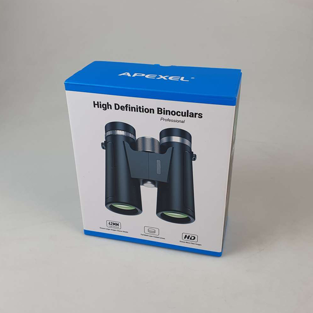 1 x APEXEL Teropong Berburu Binoculars Compact Zoom 12x42 - APL-PR12X42 1 x Kain Pembersih 1 x Tas Penyimpanan 1 x Strap 1 x Panduan Penggunaan Spesifikasi Optical Zoom 12 Kali Material Kaca Optik BAK4, Paduan Aluminium, dan Karet Silikon Dimensi Panjang Lensa: 145 mm Diameter Lensa: 42 mm Diameter Eyepiece: 18 mm Dimensi Total: 155 x 130 x 55 mm Lain-lain Jarak Pandang: 87-1000 m Sudut Pandang: 5.6 derajat Jarak Fokus Minimum: 5 m Sistem Fokus: Center Sistem Prisma: Porro (BAK4) Anti Kabut: Ya