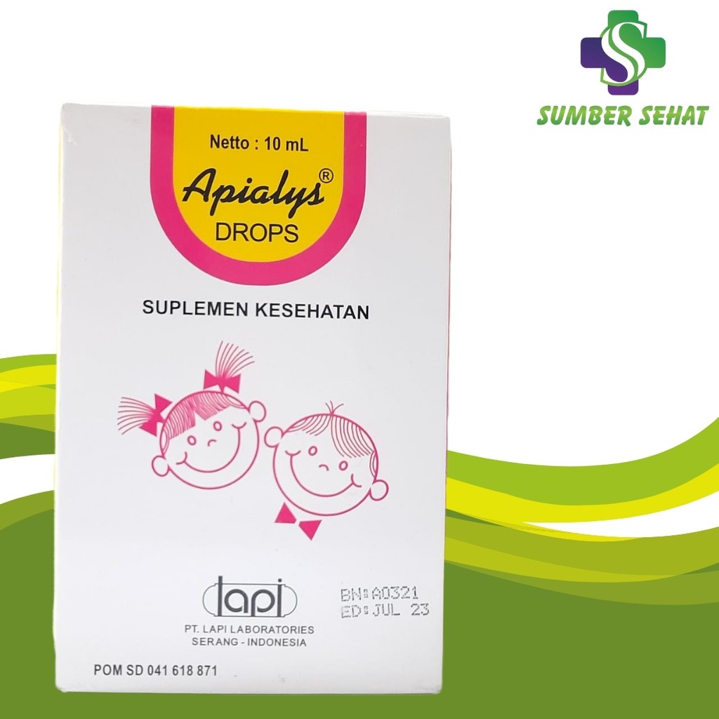 ndikasi Umum Meningkatkan nafsu makan dan stamina tubuh pada anak2 yang bertumbuh, sebagai suplemen vitamin Deskripsi APIALYS DROP 10 ML merupakan suplemen yang mengandung multivitamin dan mineral. Suplemen ini digunakan sebagai tambahan nutrisi untuk bayi dan anak-anak, membantu mengoptimalkan tumbuh kembang, meningkatkan nafsu makan dan mempercepat proses penyembuhan saat sakit. Kategori Vitamin & Suplemen Komposisi Per 0.6 mL : Vit.A 2000 IU, vit.C 30 mg, vit.D 400 IU, vit.B1 1 mg, vit.B2 1.2 mg, vit.B6 1 mg, vit.B12 2 mcg, Nicotinamide 10 mg, Pantothenol 5 mg, Lysine HCl 25 mg Dosis Anak 1-3 tahun : 1 x sehari 0.6 mL, Anak < 12 bulan : 1 x sehari 0.3 mL. Aturan Pakai Sebelum atau sesudah makan, dapat bersama makanan untuk absorpsi yang lebih baik atau jika timbul ketidak-nyamanan pada saluran cerna. Kemasan Dus, Botol @ 10 ml