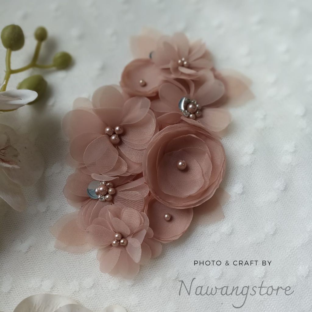 Aplikasi bunga 3D biasa diaplikasikan ke gaun , kebaya , gamis, hijab, flowercrown, headband , hiasan mahar dll