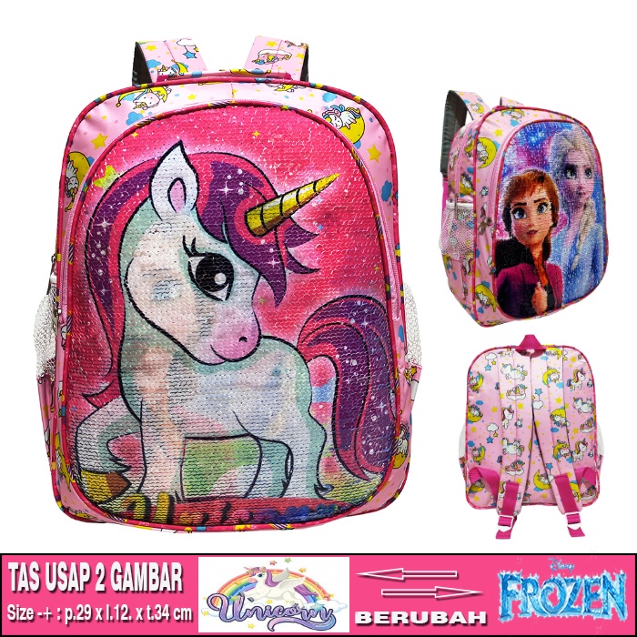 Detail APPA Tas Ransel Anak Prempuan Sekolah TK/SD Sequin Usap 2 Gambar Berubah Karakter UNICORN - FROZEN Terbaru