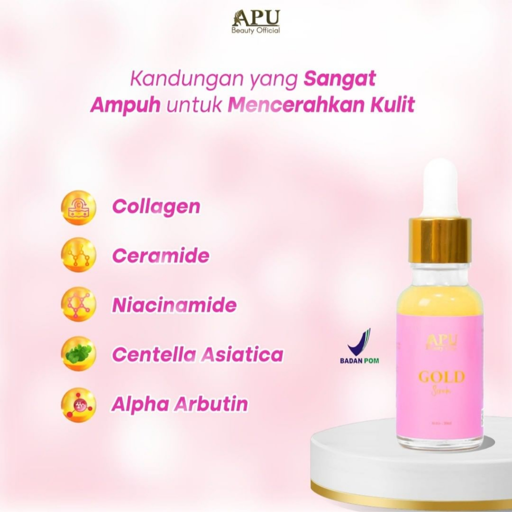Apu Serum Gold All in One adalah serum yang dibuat dengan dasar oil based dikombinasikan dengan water based yang mempunyai manfaat untuk mencerahkan, menutrisi, melindungi, menghindrasi kulit.