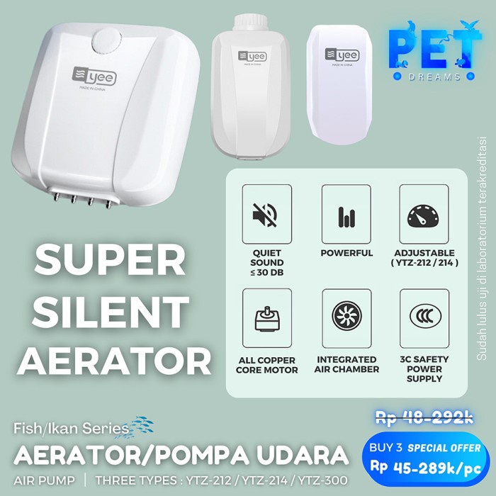 2. Silent Aerator Pump / Oxygen Pump / Air Pump / Pompa Udara Hening – YTZ-212 Solusi bagi Anda yang ingin mencari pompa udara aquarium dengan volume besar namun tidak berisik. Selain itu volume udara yang keluar dapat diatur ,sesuai kebutuhan dan besar aquarium Anda