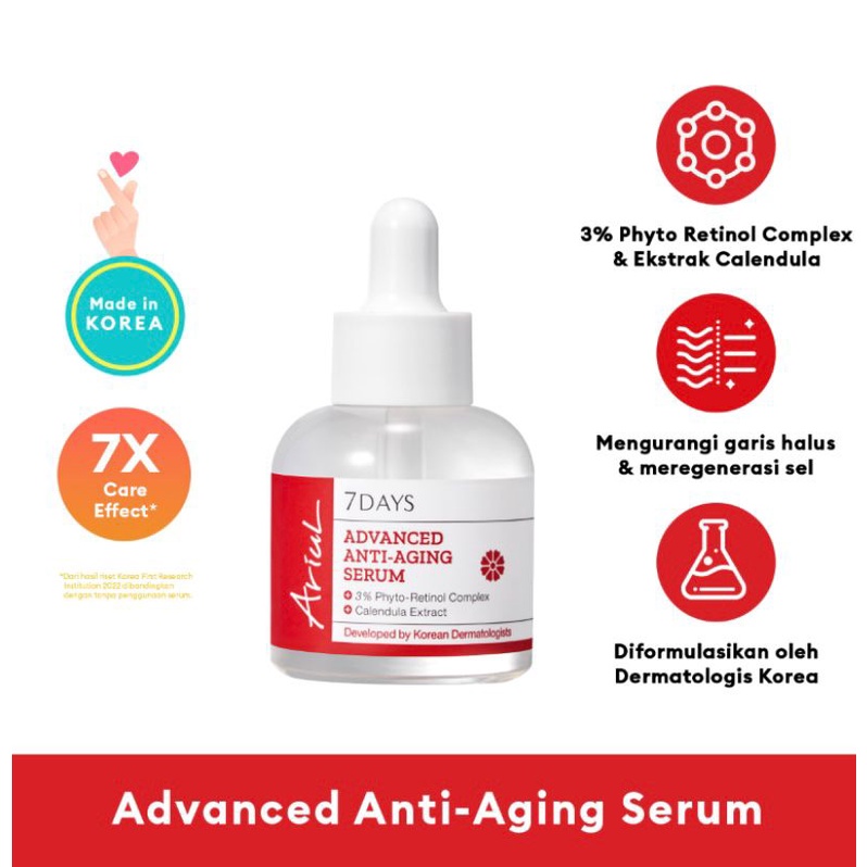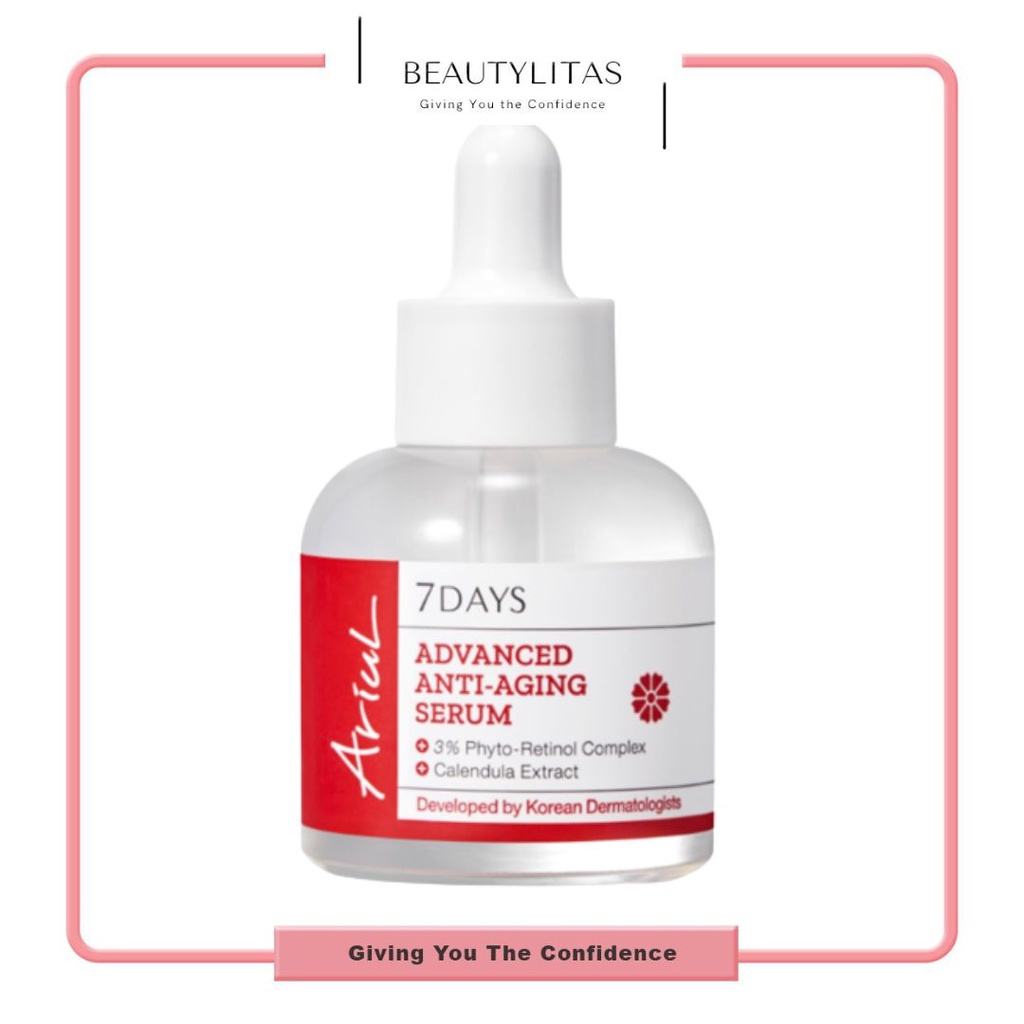 Ariul 7Days Advanced Anti-Aging Serum Serum yang dikembangkan oleh dermatolog Korea dan diformulasikan dengan kombinasi bahan aktif dan alami yang bekerja dengan efektif menyamarkan garis-garis halus pada wajah dan mempertahankan elastisitas dan kekenyalan kulit