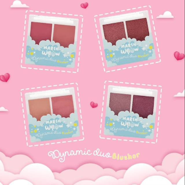 Marshwillow Dynamic Duo Blusher adalah blush berbentuk bedak padat dengan desain sederhana ini terdiri dari dua bagian warna dalam 1 palletnya dan tersedia aplikatornya untuk mempermudah. Produk ini tersedia dalam empat side berbeda, dengan finisihing matte dan shimmer yang dapat disesuaikan dengan suasana hati, blush ini tentu bisa dijadikan pilihan. Perpaduan warnanya mampu menghasilkan makeup yang fresh dan Natural.