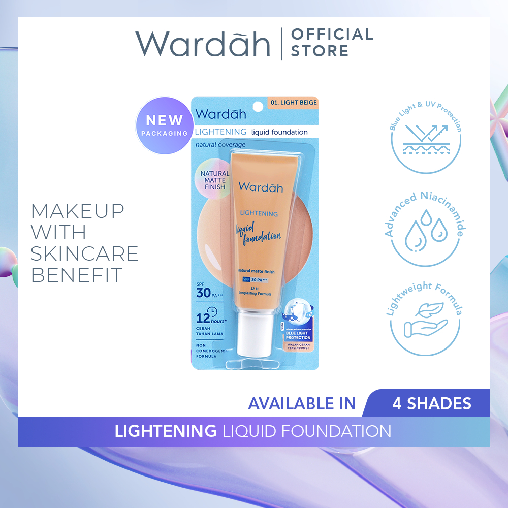 Wardah Lightening Liquid Foundation mencerahkan dan menjadikan kulit wajah lebih halus. Mampu menyerap minyak wajah. Mengandung Moist Plus dengan antioksidan yang membantu melindungi kulit dari paparan berbagai radikal bebas serta Melindungi kulit dari sinar UV A dan UV B.