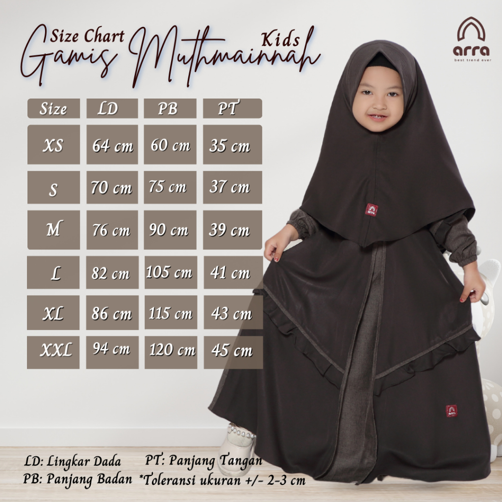 Berikut untuk Size Chart Gamis Anak detailnya: • XS: 32 x 60 x 35 • S: 35 x 75 x 37 • M: 38 x 90 x 39 • L: 41 x 105 x 41 • XL: 43 x 115 x 43 • XXL: 47 x 120 x 45 *Lebar Dada x Panjang Badan x Panjang Tangan *Dalam Satuan centimeter *Toleransi Size Chart +/- 2cm karena proses cutting bahan