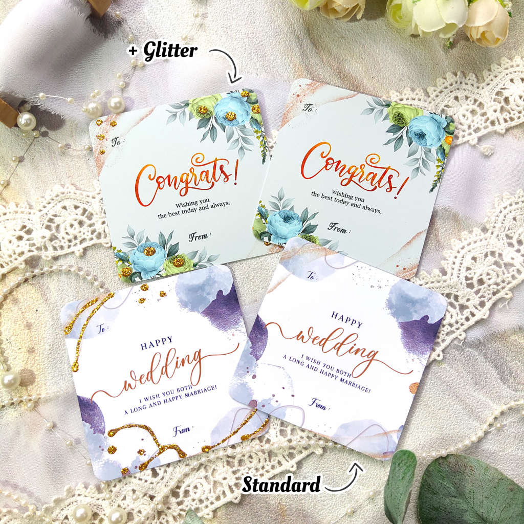 Deskripsi Kartu : - Bahan kertas glossy 260gsm. - Cetak 1 sisi. (Jika mau tambah tulisan / ganti tulisan tanyakan ke admin link produk PO untuk custom text ya) - Bisa request dibeli lubang (tuliskan di note ya, kalau tidak ada note maka akan kami kirim tanpa lubang). - Bisa pilih yang standard atau glitter (ada tempelan glitter). - Untuk order yang tambah glitter, estimasi pengerjaan 2-3 hari ya.