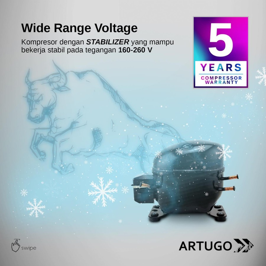 Chest Freezer Small - 100 Liter - ALUMINIUM ARTUGOChest Freezer CF 101 BW : Wide-Range Voltage Compressor (160 - 260 V) 5 Years Compressor Digital Warranty Extra Safe, Quick Freezing Noiseless Compressor, Simple Stylish Door, Flexy Mobile Energy Saving, Arrangement Easiness, Frameless Body, Seamless Welding, Removable Gasket