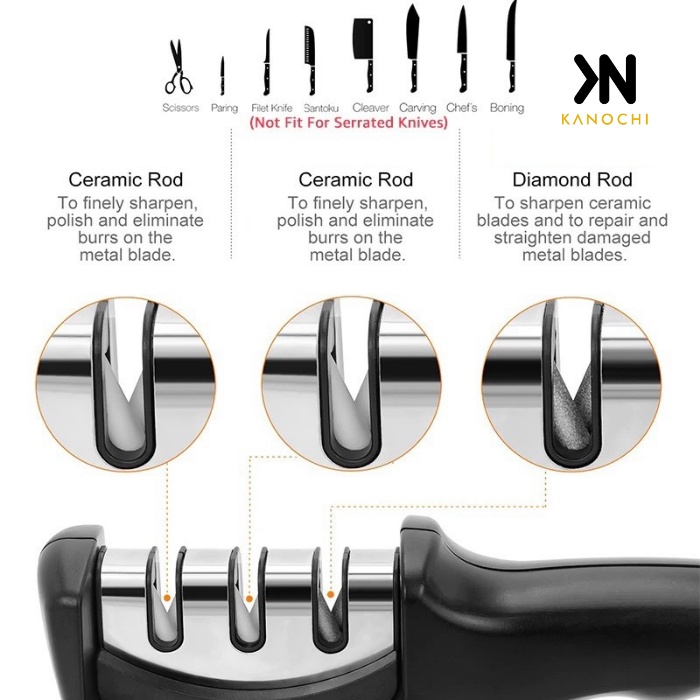 Pengasah pisau yang didesain dengan tiga tahap pengasahan yaitu kasar,halus dan akhir. Pegangan ergonomis telah dirancang agar nyaman digenggam. Terdapat bantalan anti-slip pada bagian bawah alat pengasah sehingga aman saat mengasah pisau. Produk ramah lingkungan jadi tidak perlu membuang pisau tumpul karena alat ini dapat membuat pisau yang tumpul seperti pisau yang pertama kali Anda beli. Selain pisau alat ini bisa juga digunakan untuk mengasah gunting. Tidak perlu keahlian khusus untuk mengasah pisau hanya dengan 1 tangan dapat mengasah pisau ataupun gunting.