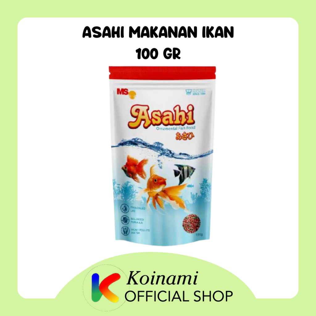 Asahi adalah pakan ikan hias yang dibuat dengan formula yang seimbang disesuaikan dengan kebutuhan nutrisi ikan agar tetap sehat menghasilkan warna kemilau, dengan pewarna alami yang ramah lingkungan menjadikan air tetap jernih.