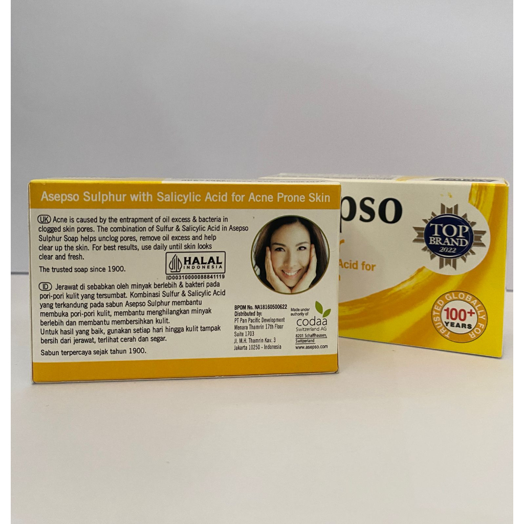 Kegunaan : Mengandung kombinasi sulfur dan salicylic acid membantu membuka pori-pori kulit, membantu menghilangkan minyak berlebih penyumbat kulit dan bakteri penyebab jerawat. Sabun Asepso ini juga membantu membersihkan kulit dan pori-pori yang tersumbat.