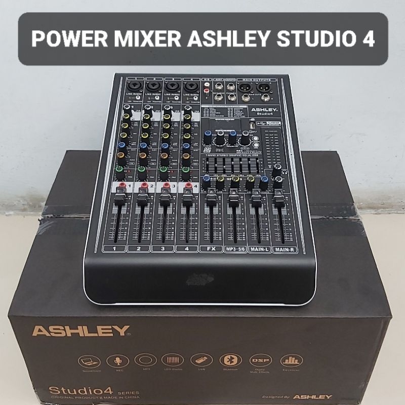 Power Mixer ASHLEY Studio 4 Feature Channel 4 Mono Mic Line Mp3 Player,USB With PC Soundcard Recording,Bluetooth Digital Multi Effect Reverb 99dsp 32bit Stereo Graphic EQ 7 Band EQ Tone 3 Band High,Mid,Low Headphone Monitor Output +48V Phantom Power On Each Channel Mute On Each Channel Body Material: Iron Plate Fader 70mm Power 2*260 watt 4 ohm Packing Type: Carton