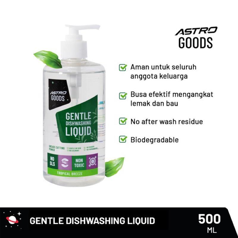 Astro Goods Gentle Dishwashing Liquid diformulasikan tanpa SLS, paraben, formaldehyde dan bahan pewarna, dengan aroma lembut Tropical Breeze yang mengikuti standar International Fragrance Association. Kaya busa namun tetap lembut di tangan karena menggunakan plant derived detergents. Efektif mengangkat lemak membandel dan menghilangkan bau pada peralatan makan dan masak untuk keluarga, tanpa meninggalkan residu sabun setelah dibilas dengan baik. Astro Goods Gentle Dishwashing Liquid - Gentle for you and the Earth.