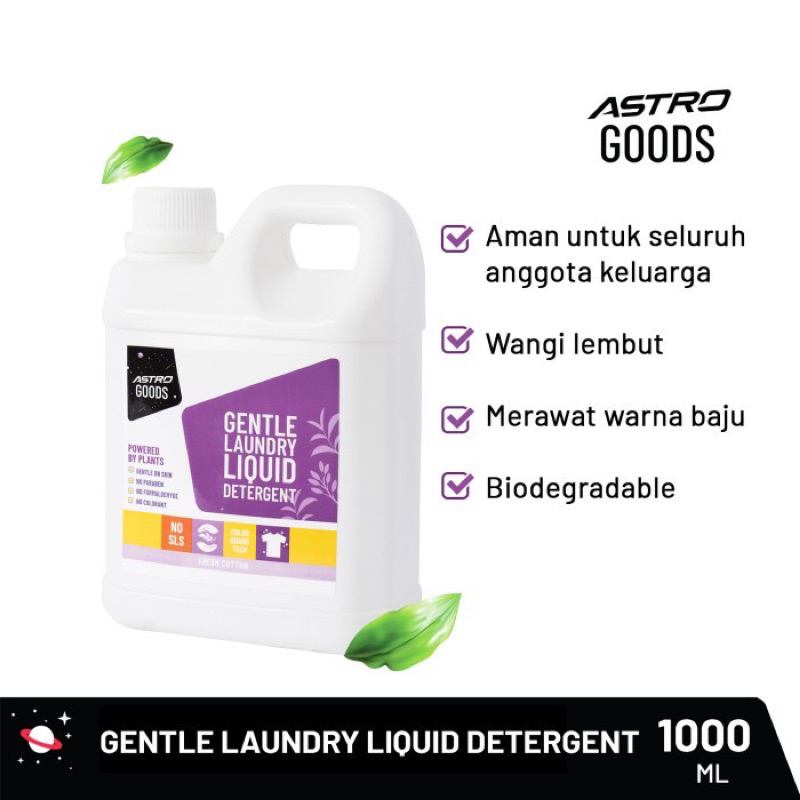 Astro Goods Laundry Liquid Detergent, menggunakan formula plant based, berbusa dengan baik, lembut di tangan dan efektif membersihkan pakaian anda sekeluarga. Diperkaya dengan color guard technology untuk merawat warna pakaian kesayangan, tanpa bahan kimia berbahaya seperti SLS, paraben, formaldehyde dan bahan pewarna. Aman diaplikasikan pada mesin cuci. Beraroma Fresh Cotton yang lembut dan mengikuti standar yang ditetapkan oleh International Fragrance Association. Astro Goods Gentle Laundry Liquid Detergent - Gentle for you and the Earth.