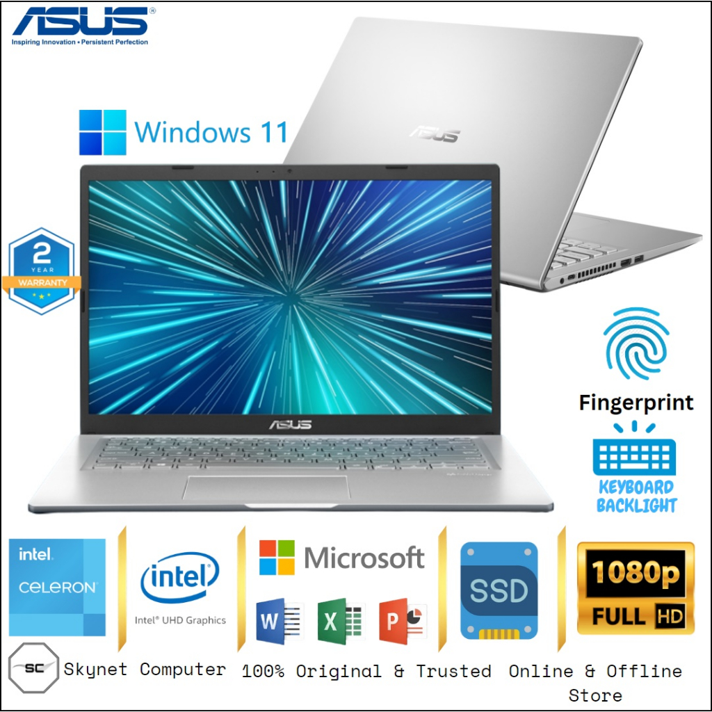 Spesifikasi: - Intel® Celeron® N4020 (1.1 GHz base frequency, up to 2.8 GHz burst frequency, 4 MB L2 cache, 2 cores) - RAM 4GB DDR4/RAM8GB/16GB DDR4 Sesuai Varian - STORAGE : SSD256GB (sesuai varian) - STORAGE : SSD512GB(256GB+256GB)Sesuai Varian - INTEL HD GRAPHIC - 14inc FHD 1920 x 1080 - Operating System : Windows 11 Home + Office 2021 Original - Audio : ASUS SonicMaster Technology - KEYBOARD BACKLIGHT - Fingerprint - Networking : Wi-Fi 5(802.11ac)+Bluetooth 4.1 (Dual band) 1x1 Slots/Interface : 1x 3.5mm Combo Audio Jack 1x HDMI 1.4//2x USB 2.0 Type-A 1x USB 3.2 Gen 1 Type-A 1x USB 3.2 Gen 1 Type-C Battery : 32WHrs, 2S1P, 2-cell Li-ion Power Adapter : Output : 19V DC, 1.75A, 33W, Input : 100-240V AC 50/60Hz universal System Dimensions : 32.50 x 21.60 x 2.31 - 2.31 cm Weight : 1.6 KG