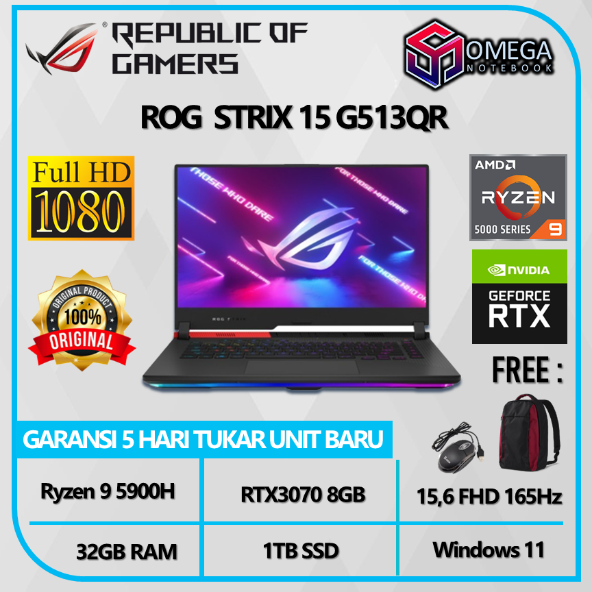 SPESIFIKASI : Processor : AMD Ryzen™ 9 5900HX Processor 3.1 GHz (16M Cache, up to 4.5 GHz) Memori Standar : 32 GB DDR4 3200MHz UP TO 32GB Tipe Grafis : NVIDIA® GeForce RTX™ 3070 Laptop GPU 8GB GDDR6 Ukuran Layar : 15.6" (16:9) LED-backlit FHD (1920x1080) Anti-Glare IPS-level 165Hz Panel Hard Disk : 1TB M.2 NVMe™ PCIe® 3.0 SSD Keyboard : Backlit Chiclet Keyboard Per-Key RGB Wireless Network : Wi-Fi 6(802.11ax)+Bluetooth 5.1 (Dual band) 2*2