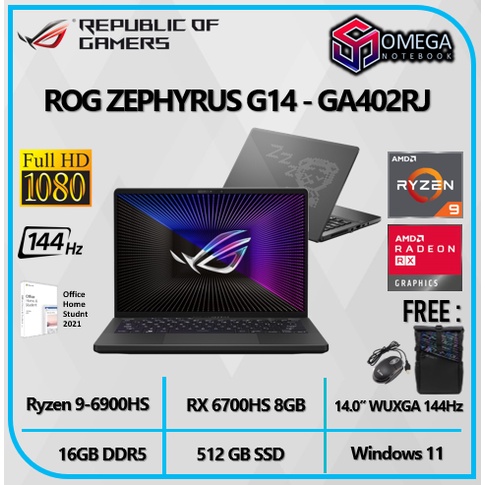 SPESIFIKASI : 📌Processor : AMD Ryzen™ 9-6900HS Mobile Processor (8-core/16-thread, 16MB cache, up to 4.9 GHz max boost) 📌Graphics : AMD Radeon™ RX 6700S, 8GB GDDR6, MUX Switch + Optimus, ROG Boost: up to 100W(SmartShift) 📌Display : 14-inch FHD+ 16:10 (1920 x 1200, WUXGA), 144Hz, 3ms, Adaptive-Sync, IPS-level, 400nits, 100% sRGB, Pantone Validated 📌Memory : 16GB (8GB DDR5 on board + 8GB DDR5-4800 SO-DIMM), MAX 24GB 📌Storage : 512GB M.2 NVMe™ PCIe® 4.0 SSD 📌Wireless : Wi-Fi 6E(802.11ax) (Triple band) 2*2 + Bluetooth 5.2 (*BT version may change with OS version different.) 📌Keybord : Backlit Chiclet Keyboard RGB 📌Operating System : Windows 11 + OHS