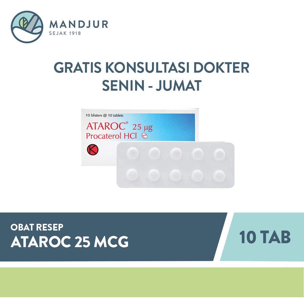 FARMAKOLOGI Ataroc 25 µg (Procaterol HCl) memiliki struktur dasar karbostiril, sehingga responnya tinggi terhadap reseptor beta2 serta menunjukkan efek yang kuat dan tahan lama. - Aksi bronkodilator Meregangkan otot polos bronkus dengan meningkatkan konsentrasi cAMP didalam sel-sel otot polos bronkus. - Selektivitas terhadap beta2 Efek beta1 seperti peningkatan kekuatan kontraksi miokardium / peningkatan detak jantung / lipolisis secara signifikan lebih rendah dibanding yang terjadi pada salbutamol, terbutalin, heksoprenalin, bitolterol. Selektivitas terhadap beta2 sangat baik. - Lama waktu kerja Obat ini memiliki masa kerja panjang karena stabil terhadap COMT, MAO dan enzim-enzim katabolik lainnya Penggunaan obat ini HARUS DENGAN RESEP DOKTER.