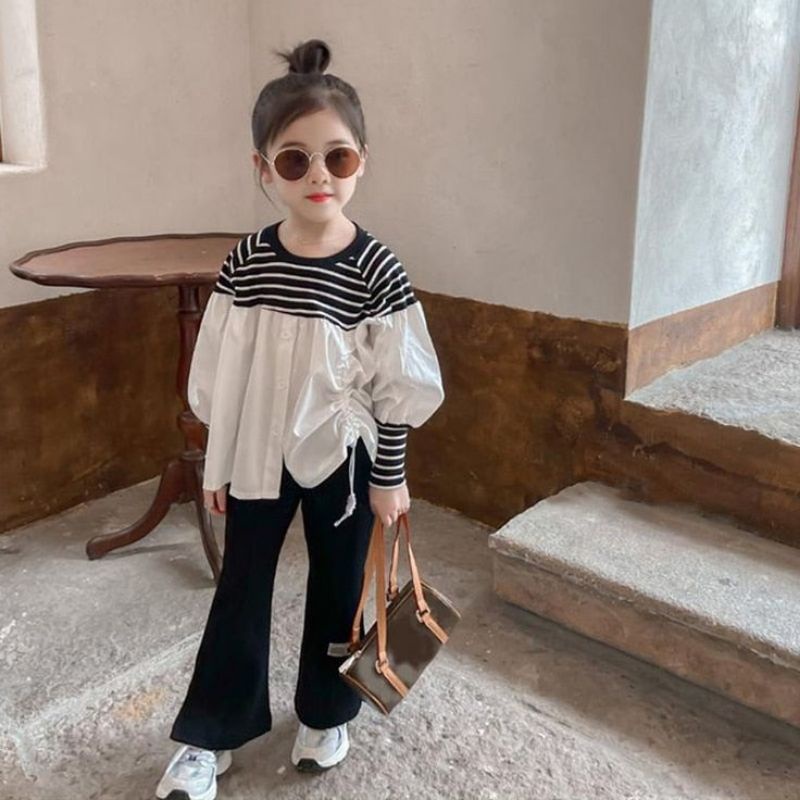 Bahan kaos mix rayon Motif polos mix salur Bahannya adem, lembut, nyaman di pakai si kecil perpaduan yang cakeepp banget moms, ditambah dengan motif salur, semakin bikin kesan korean girls banget ๐๐