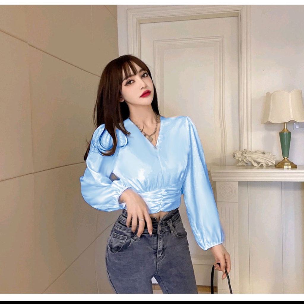 Detail Atasan blus wanita tangan panjang satin velvet gaya korea 911