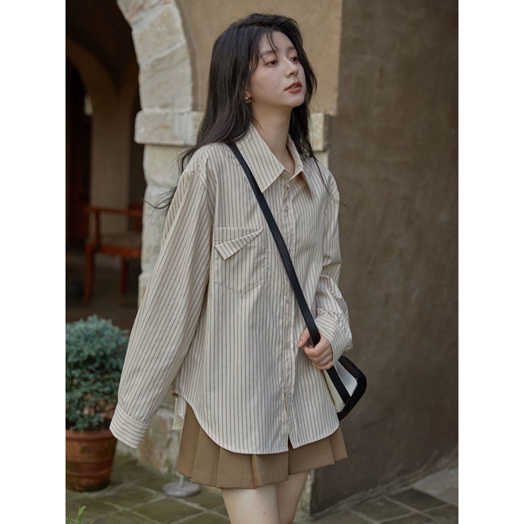 Detail Atasan kemeja lengan panjang Prancis bergaris tipis musim semi dan musim gugur yang baru