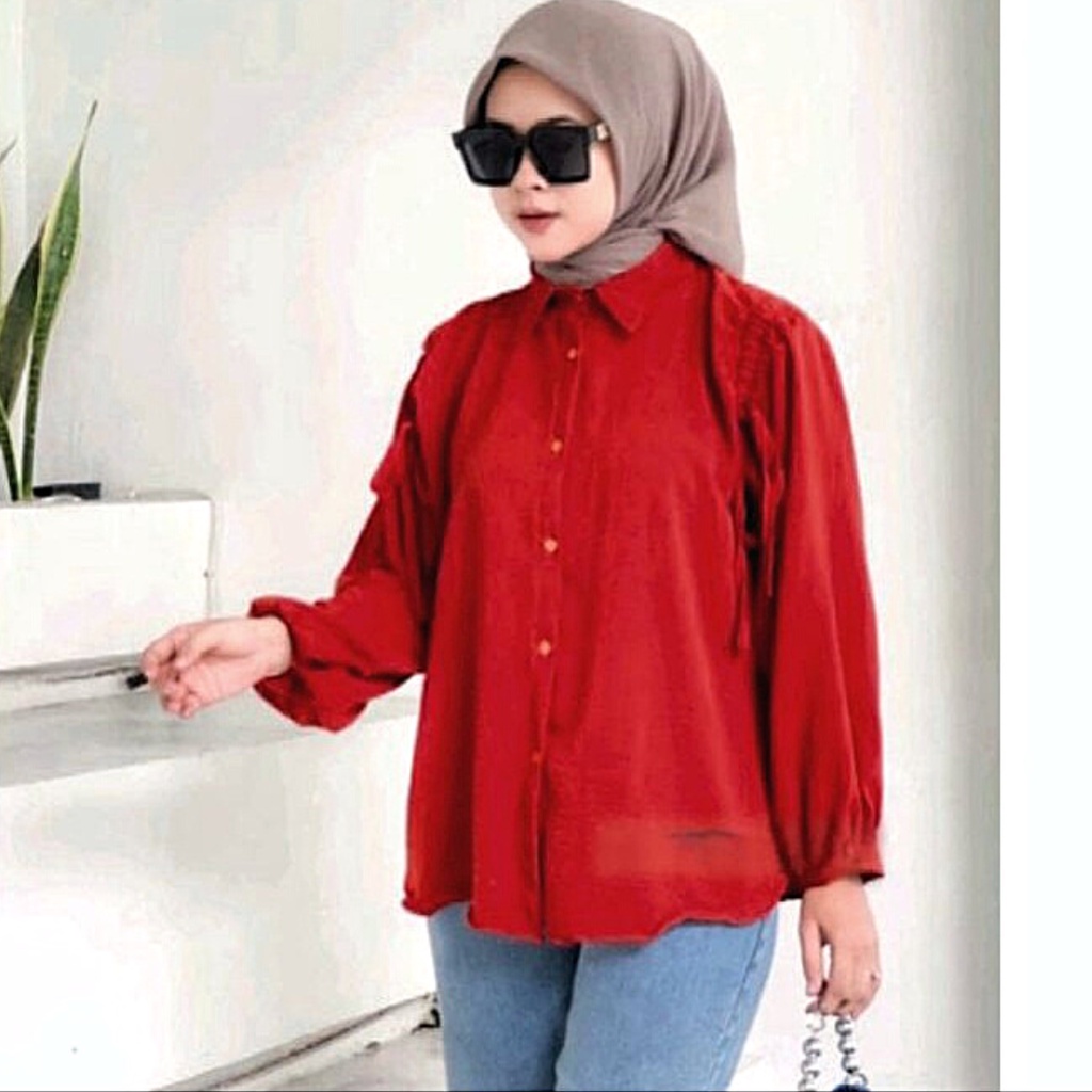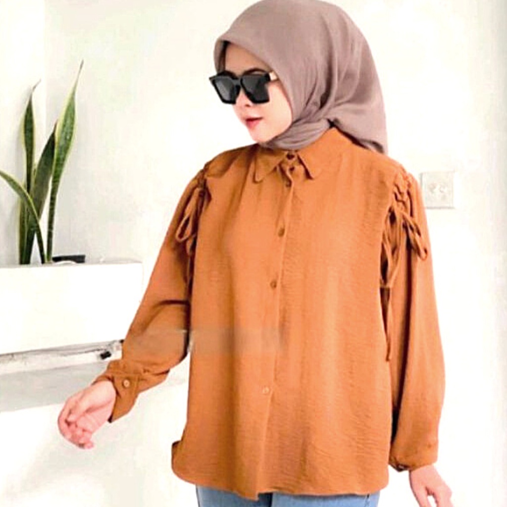 🔸DETAIL : ✔️ Blouse Berbahan Kain Crinkle Airflow Premium ✔️ pergelangan Tangan Kancing Aktif ✔️ Aksen Serut di Bahu ✔️ Kancing Depan Aktif Busui friendly