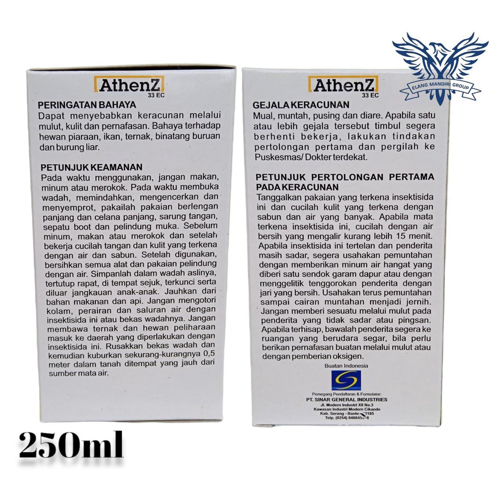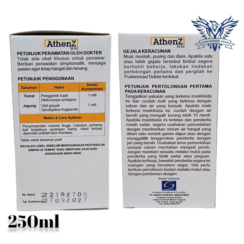 Deskripsi Produk ATHENZ 33 EC 250ml Merupakan insektisida yang biasa digunakan untuk mengendalikan ulat grayak pada bawang merah, jagung, padi dll dengan dosis anjuran 0.75ml-1ml/liter, penyemprotan volume tinggi 600l/ha.