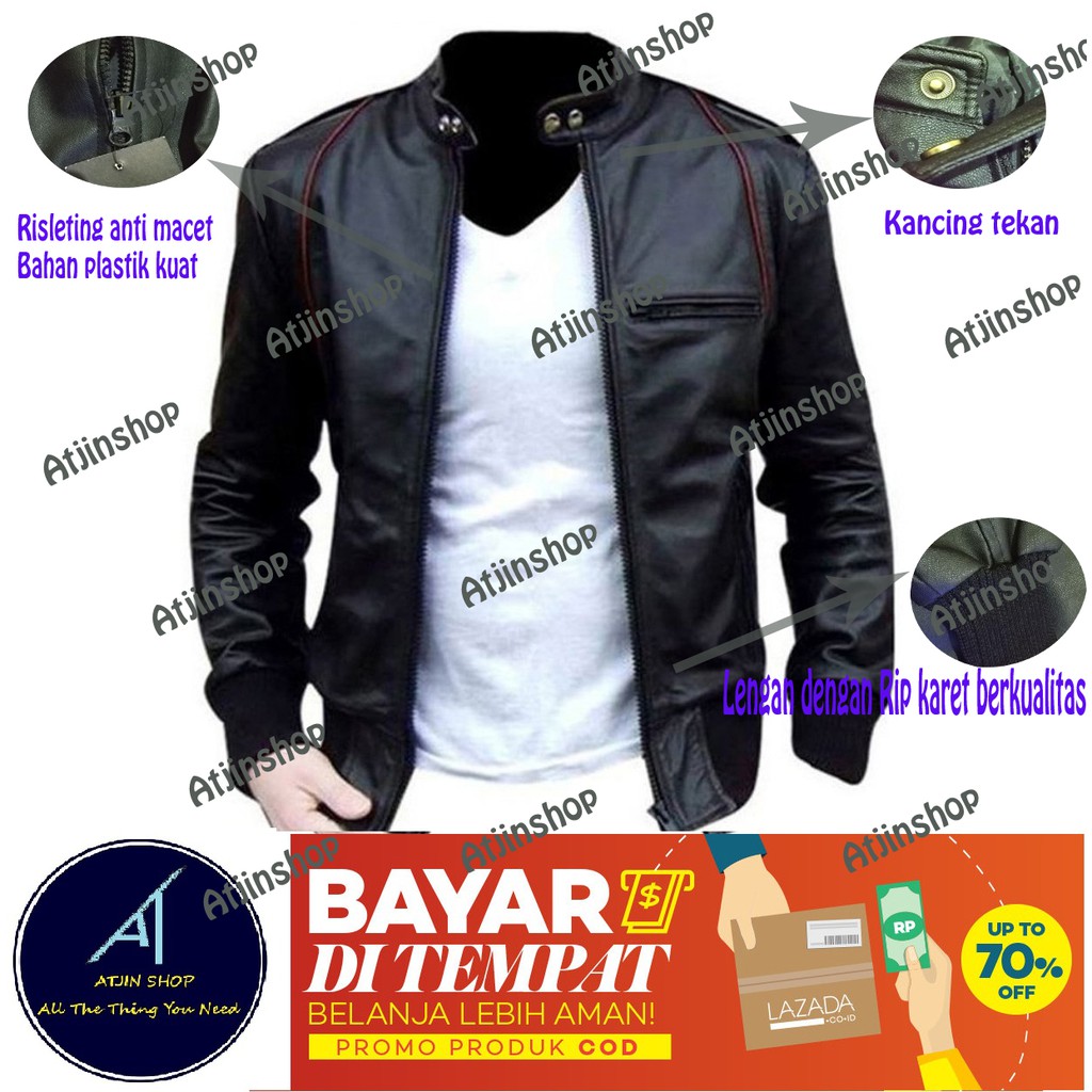 Foto 100% diambil dari stok barang tanpa proses editing , Kondisi Barang = 100% sesuai dengan Foto Ready warna Full hitam dan Full Coklat Terdapat busa di bagian bahu sehingga postur akan tegap dan nyaman Model Slim fit dan sesuai dengan bentuk badan Material terbuat dari Faux leather grade "Ferrari" yang awet dan tahan air Terdapat lapisan Puring "Dormeuil England" yg nyaman dan lembut dibagian dalam jaket Terdapat kantong tambahan di bagian dalam jaket untuk kunci / dompet Jaminan packing dan input resi 1x 24 jam dari seller prioritas Atjin Shop