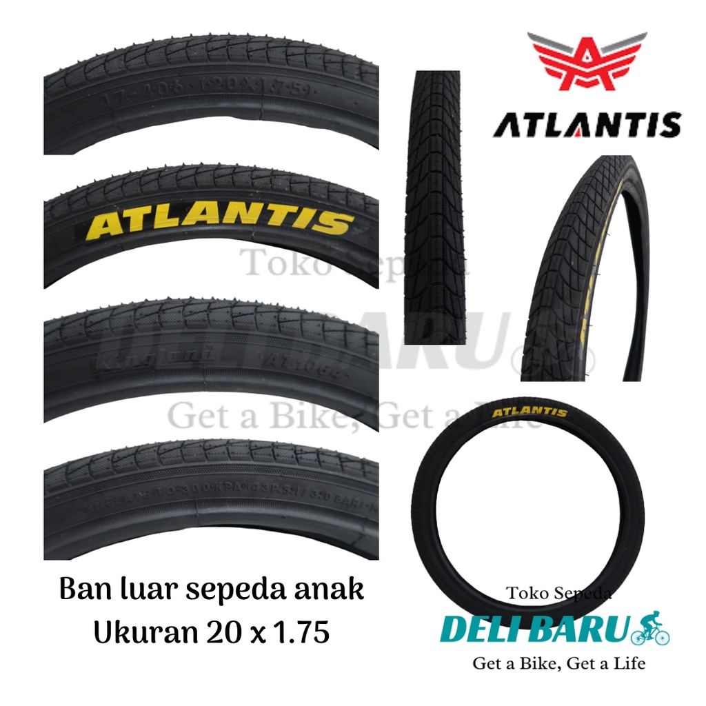 Ban luar untuk sepeda anak, sepeda mini, sepeda lipat. Ukuran 20 x 1.75. ETRTO 47-406. Merk atlantis. Type AT1064. Warna hitam. Bahan nylon. Tekanan angin maksimal 43 P.S.I. Motif dan warna sama seperti gambar ya (real pict). Harga satuan (1 buah ban luar). * Ongkos kirim dihitung dimensi ban ya. * Packing ban tidak dilipat, hanya dibalut plastik saja.