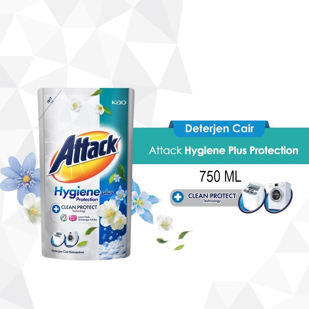* Putih Cemerlang ATTACK Liquid Attack Hygiene + Protection dapat menghilangkan noda dengan cepat sehingga pakaian menjadi putih cemerlang. * Anti Kuman ATTACK Liquid Attack Hygiene + Protection dapat mencegah timbulnya bakteri dan bau apek pada pakaian. * Noda Hilang ATTACK Liquid Attack Hygiene + Protection dengan formula Max Power, efektif mengangkat noda seperti noda kopi, noda saos, noda makanan, noda tanah, noda di kerah, noda darah dan sebagainya.
