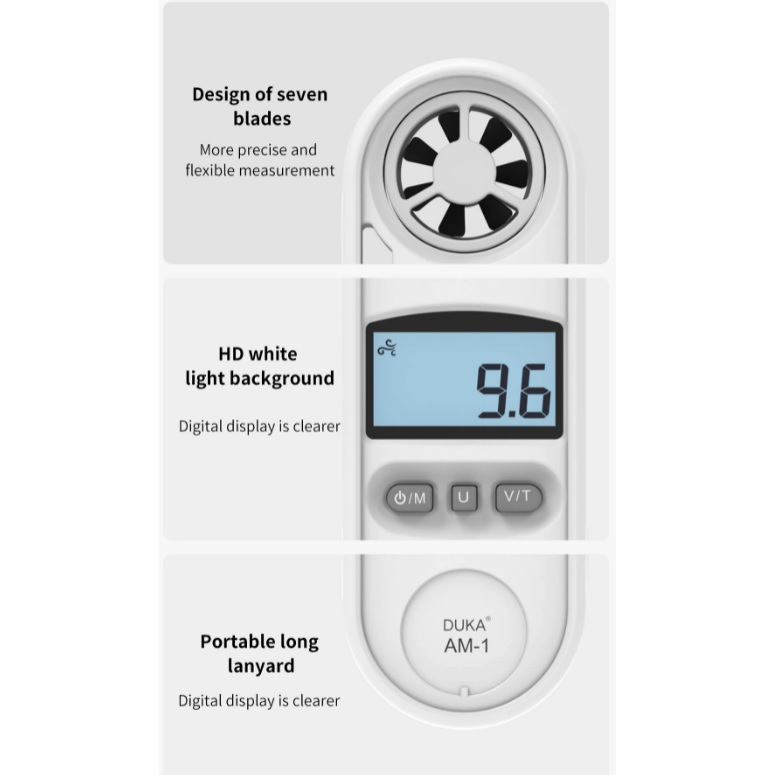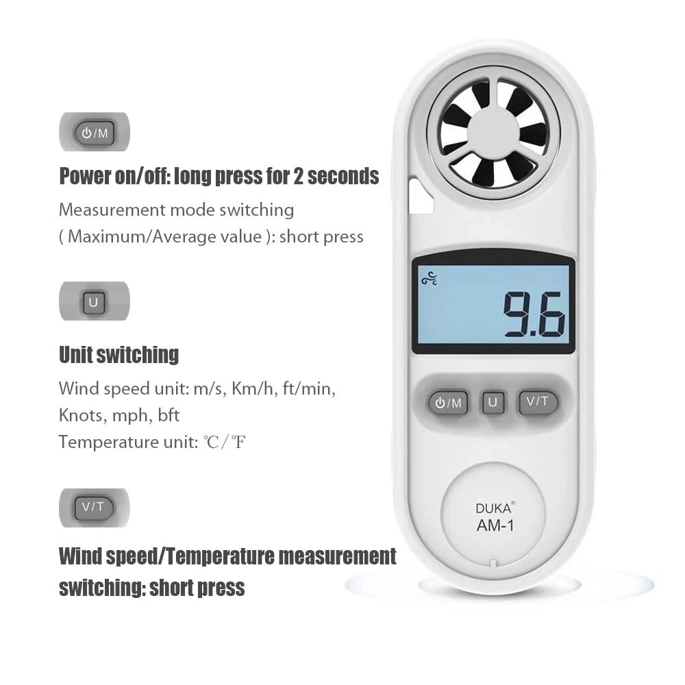 Specification Brand: ATuMan DUKA Product Name: Digial Anemometer Product Model: AM-1 Operating Wind Speed: 0.3-30m/2 Wind Speed Measurement Error: +/- 5% Wins Speed Resolution: 0.1m/s Operating Temperature: -10 ~ 45 Celsius (14~113 Fahrenheit) Temperature Measurement Error: +/- 2 Celsius Temperature Resolution: 0.2 Celsius Operating Humidity: Less than 90%RH Wind Speed Unit: m/s; km/h; ft/min; mph; knots Temperature Unit: Celsius/Fahrenheit Maximum Function: YES Average Function: YES Wind Rating: YES White Backlight: YES Wind Chill Reminder: YES Automatic Shut-Down: YES (after 14 minutes of inactivity) Battery: CR2032 (INCLUDED)
